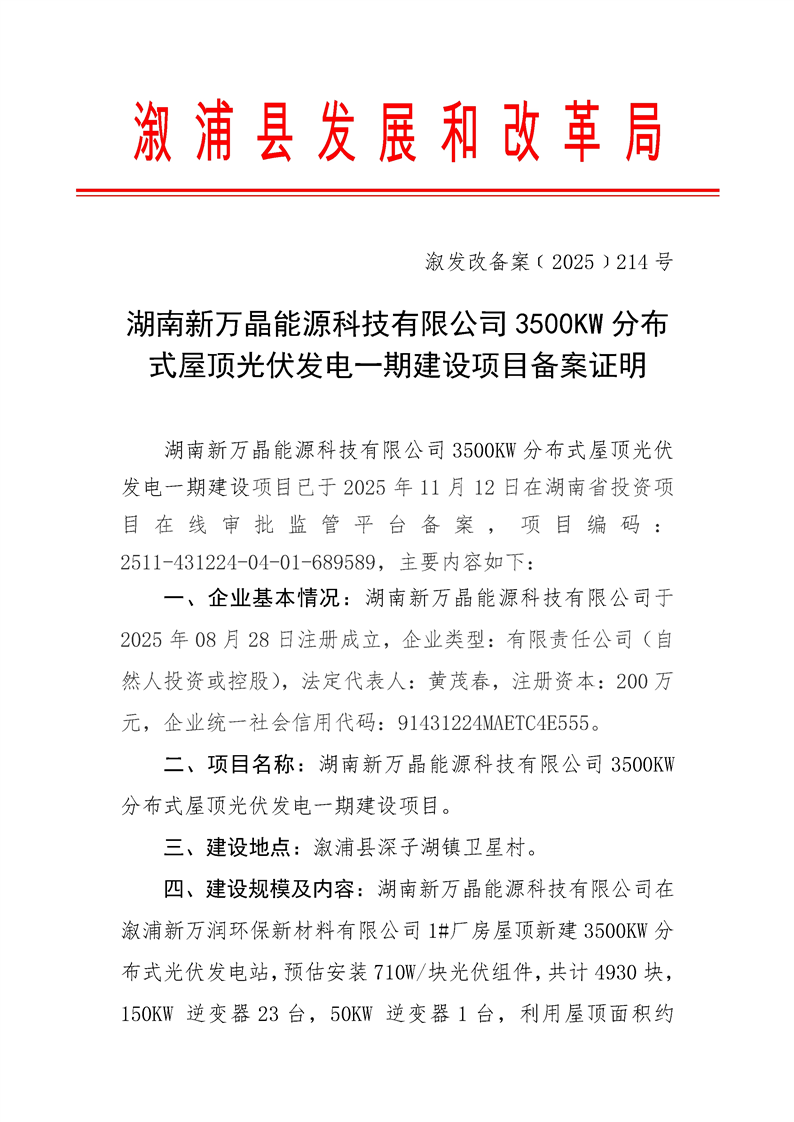 湖南新万晶能源科技有限公司3500KW分布式屋顶光伏发电一期建设项目