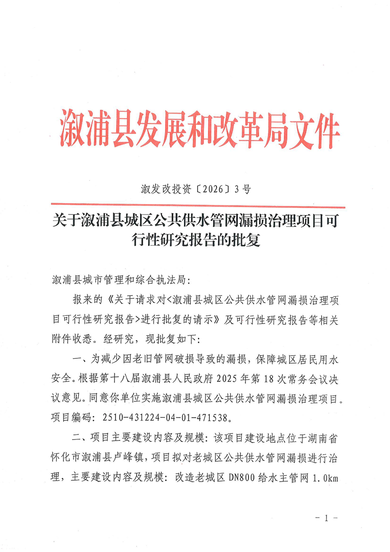 关于溆浦县城区公共供水管网漏损治理项目可行性研究报告的批复