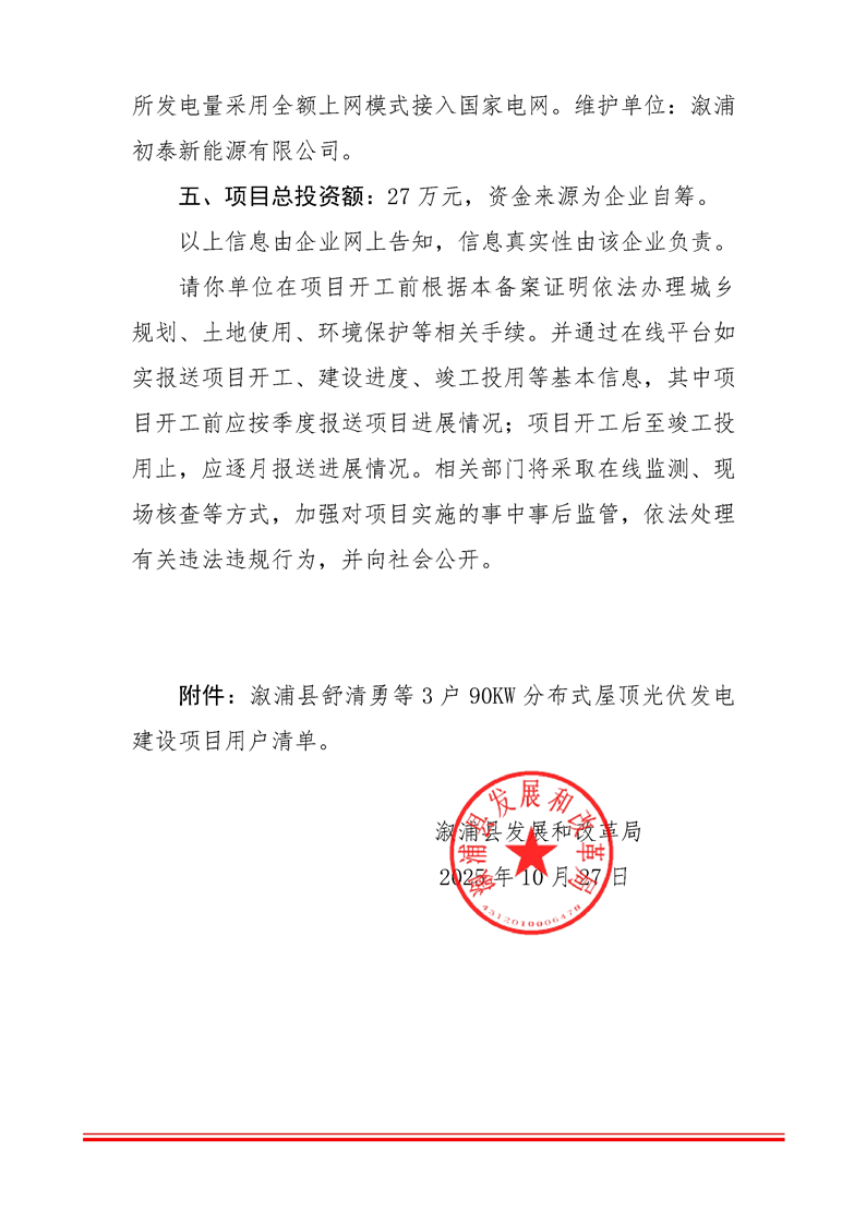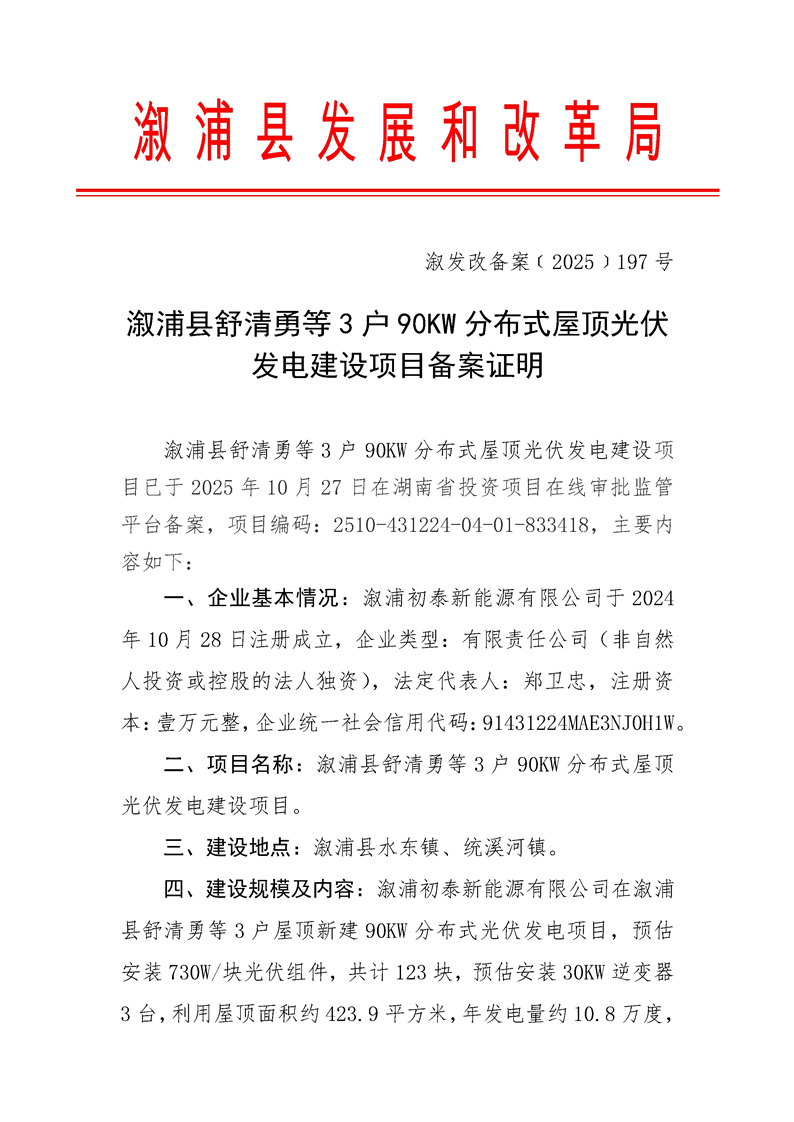 溆浦县舒清勇等3户90KW分布式屋顶光伏发电建设项目