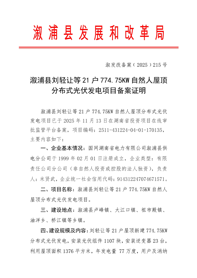 溆浦县刘轻让等21户774.75KW自然人屋顶分布式光伏发电项目