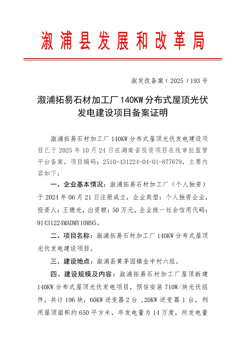 溆浦拓易石材加工厂140kw分布式屋顶光伏发电建设项目