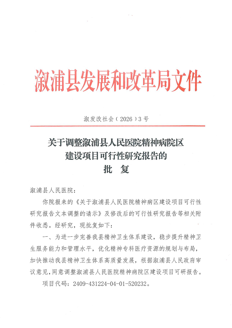 关于调整溆浦县人民医院精神病院区建设项目可行性研究报告的批复