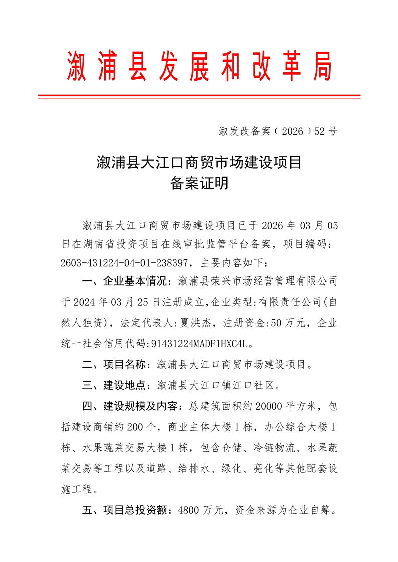 溆浦县大江口商贸市场建设项目备案证明