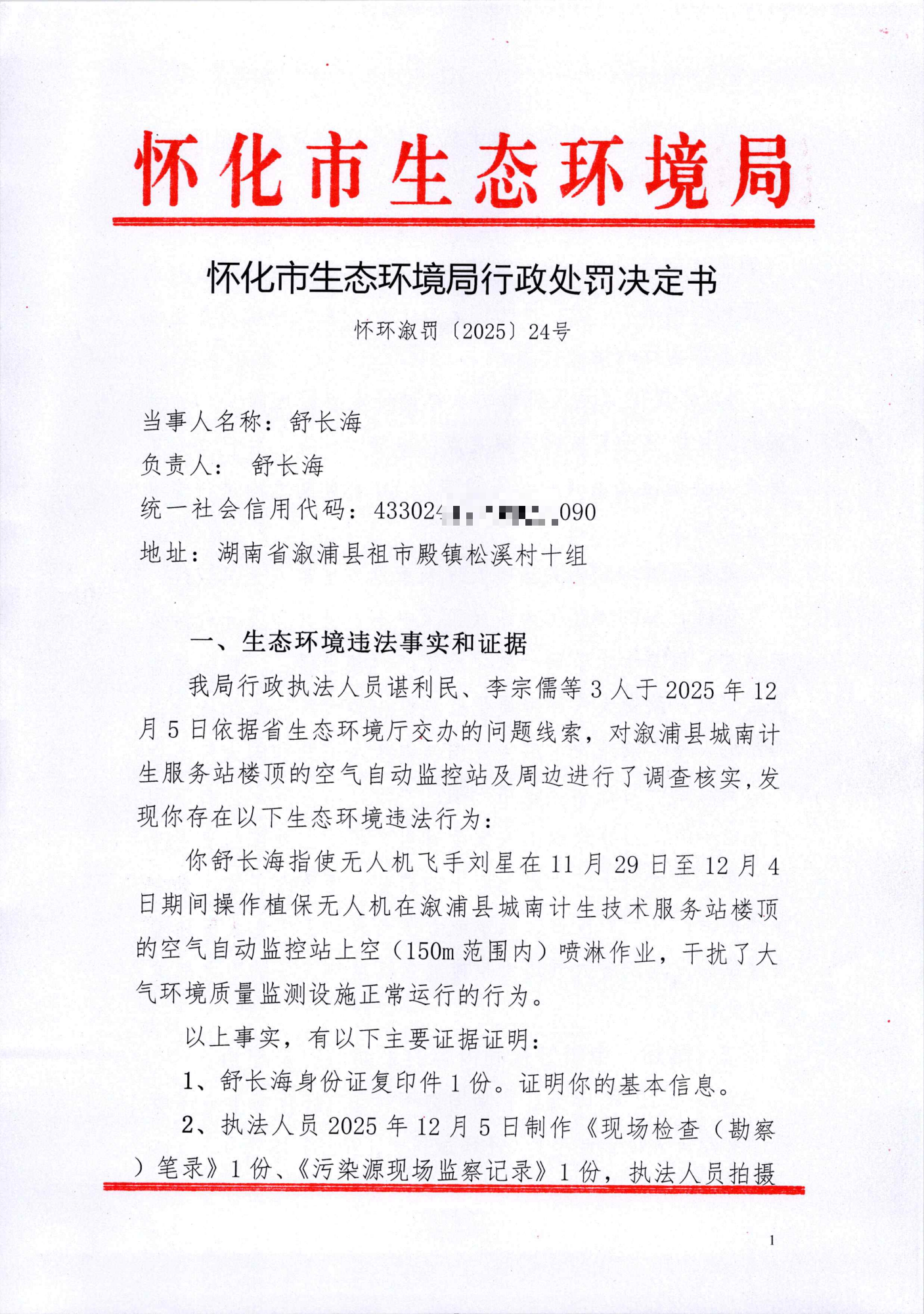 舒长海:违反《中华人民共和国大气污染防治法》行政处罚决定书