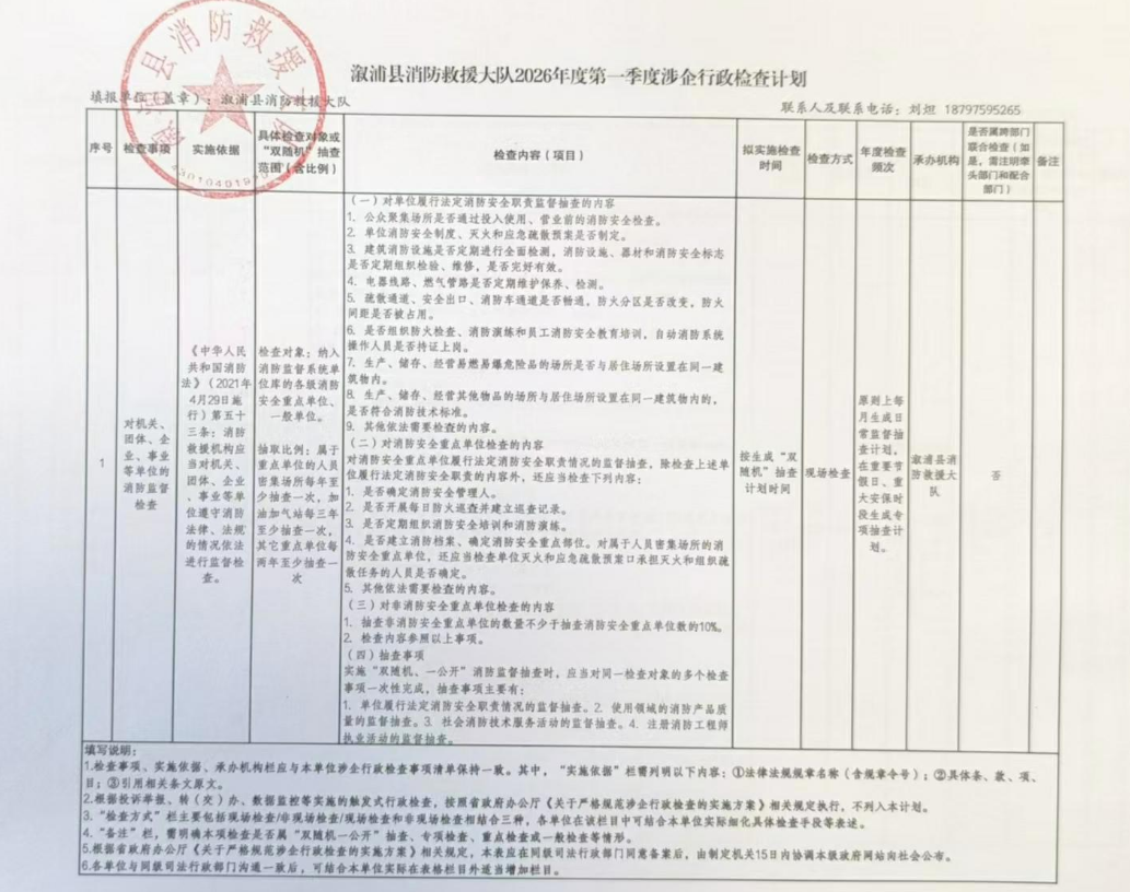 溆浦县消防救援大队2026年第一季度涉企行政检查计划