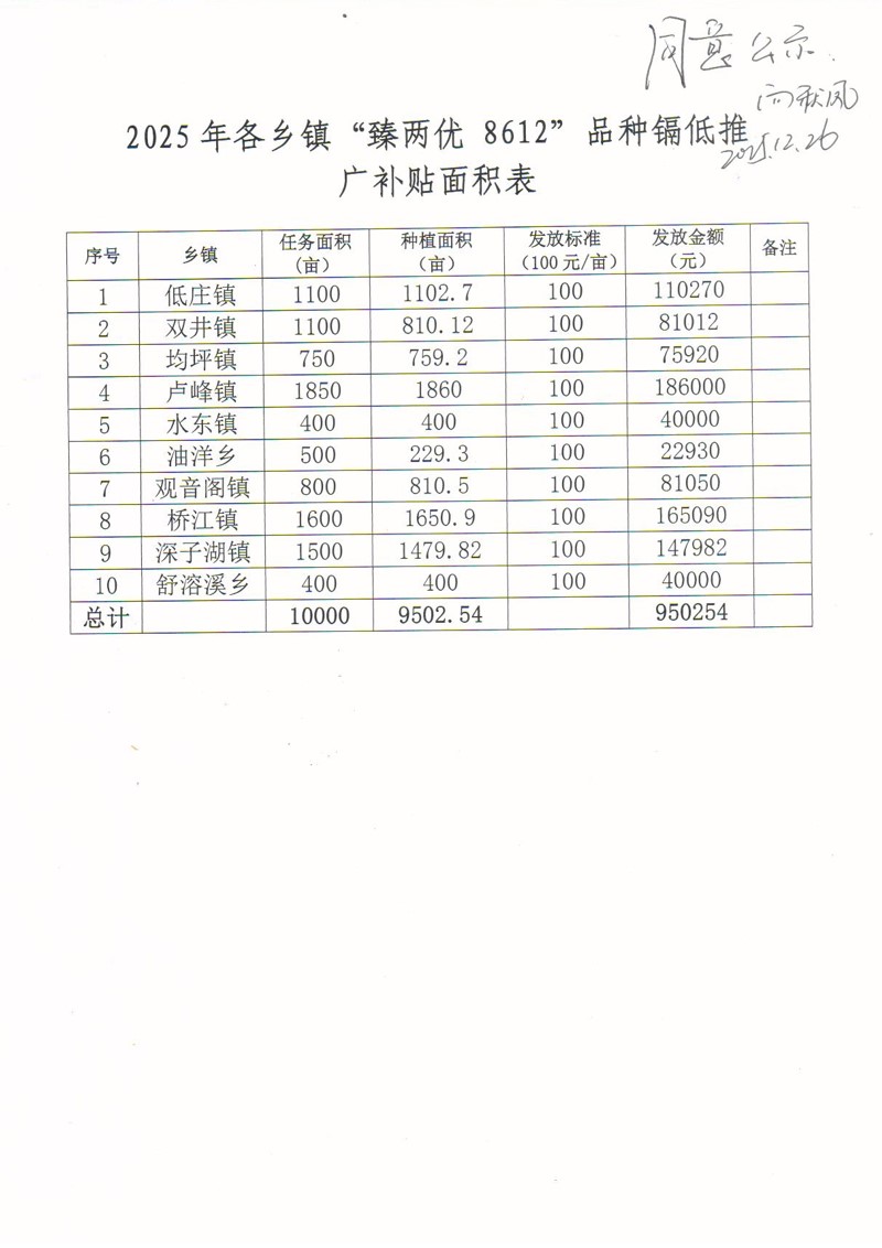 2025年度各乡镇“臻两优8612”品种镉低推广补贴面积表