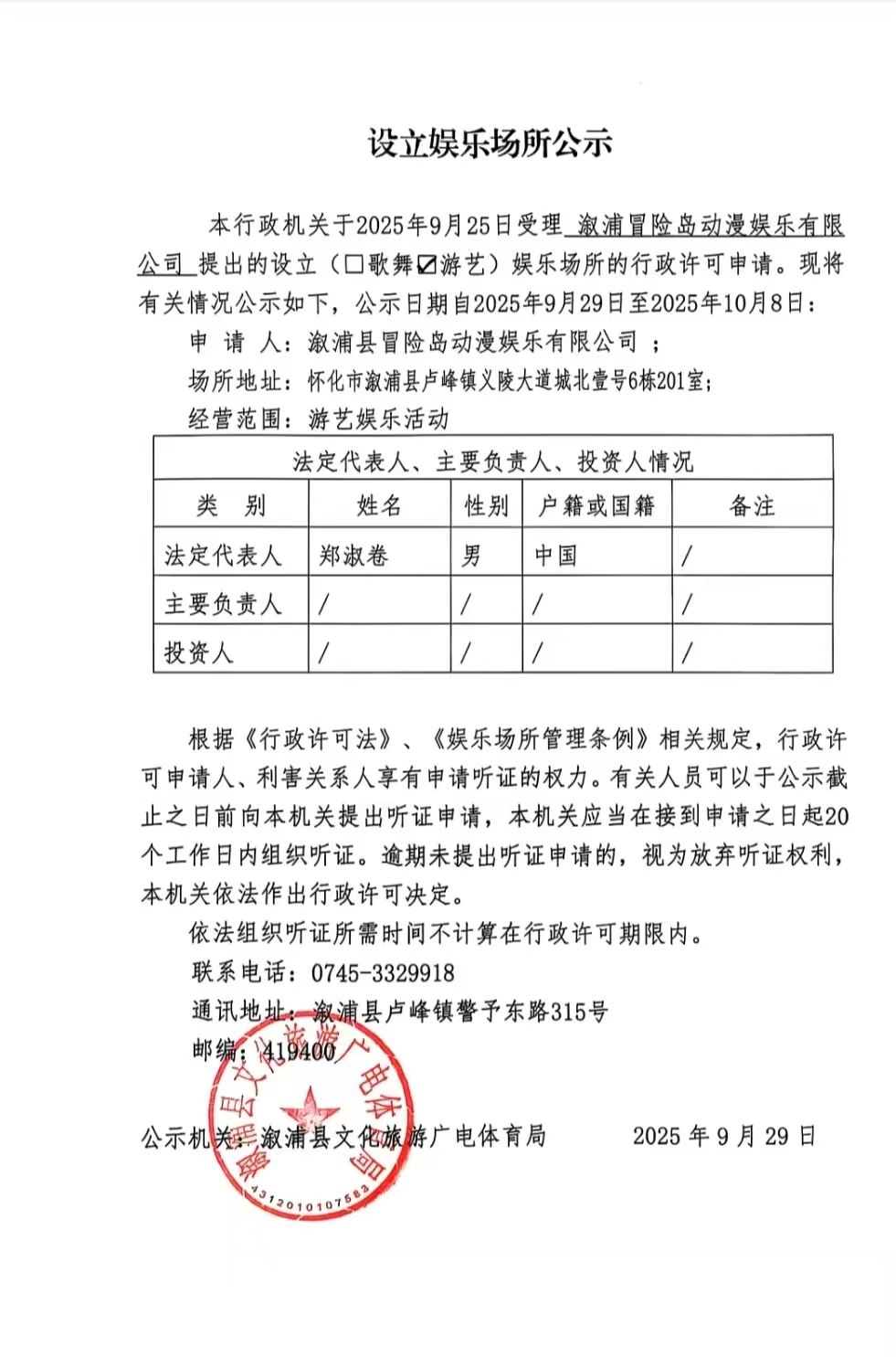 娱乐场所设立-----溆浦冒险岛动漫娱乐有限公司