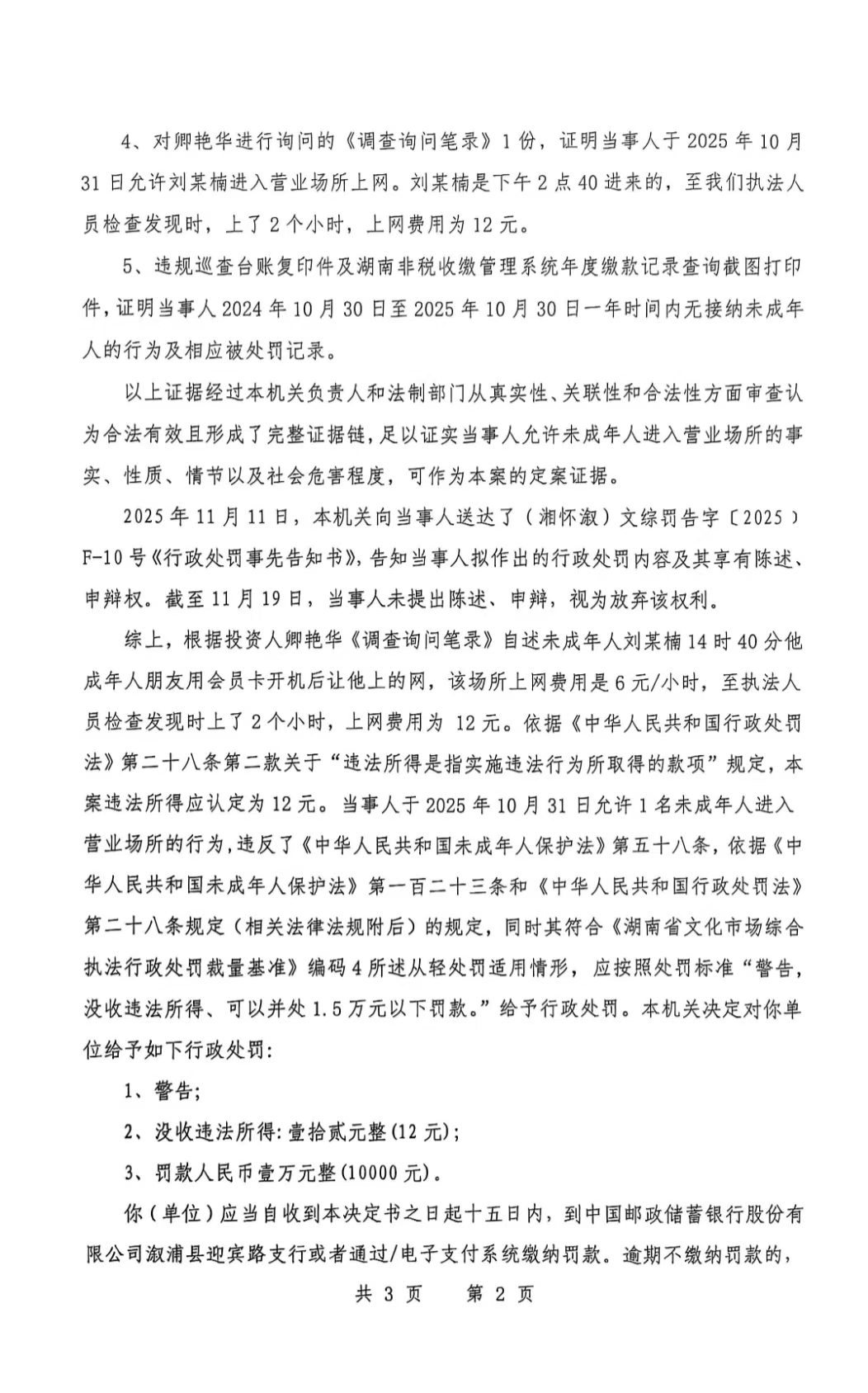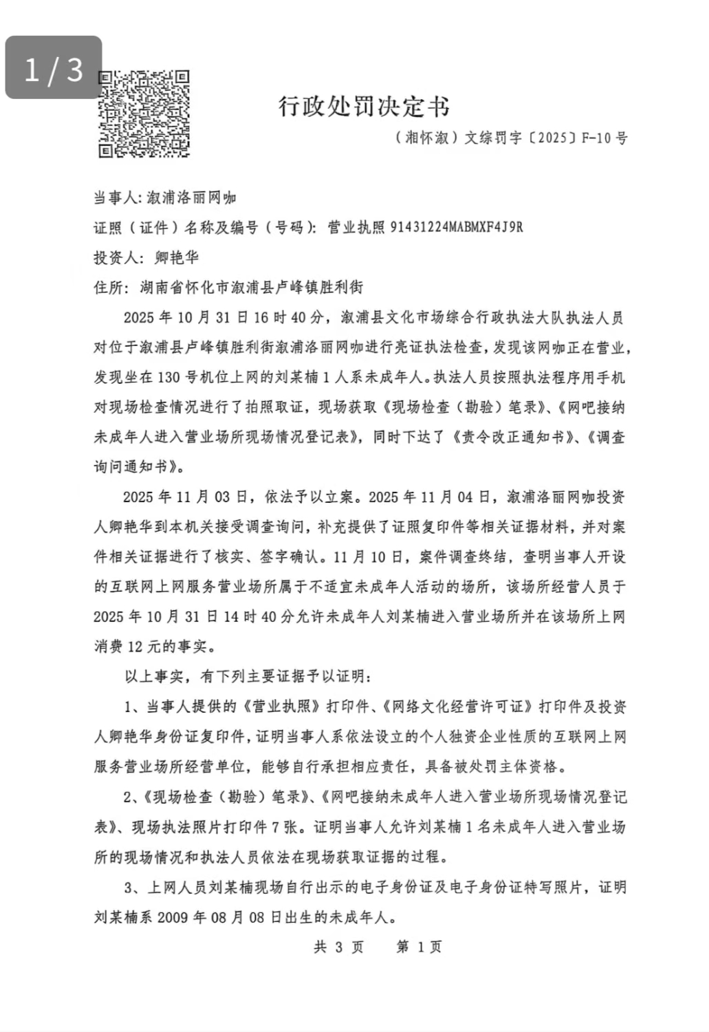 行政处罚决定书--溆浦洛丽网咖 (湘怀溆)文综罚字 〔2025〕F-10号