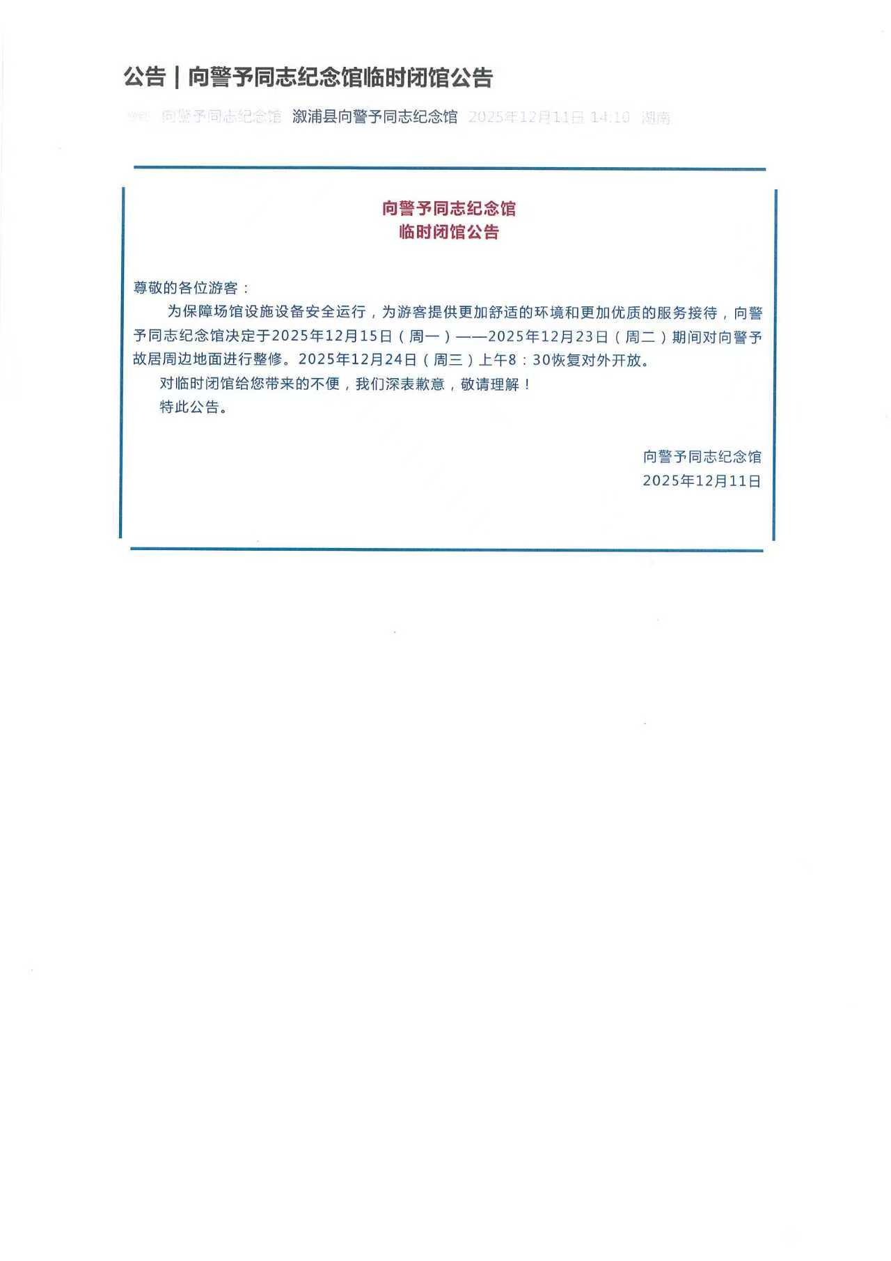 公告 | 向警予同志纪念馆临时闭馆公告