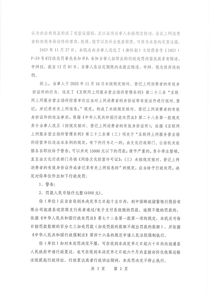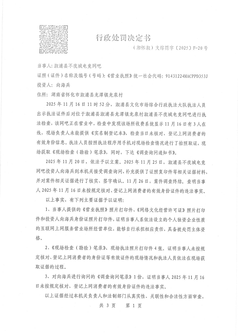 行政处罚决定书--溆浦县不夜城电竞网吧(湘怀溆)文综罚字 〔2025〕F-20号