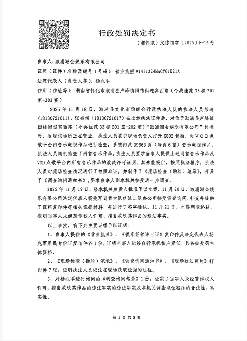 行政处罚决定书--溆浦潮会娱乐有限公司 (湘怀溆)文综罚字 〔2025〕F-16号