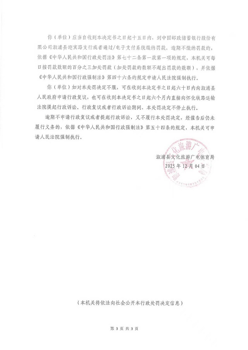 行政处罚决定书--溆浦半岛酒店管理有限公司 (湘怀溆)文综罚字 〔2025〕F-21号