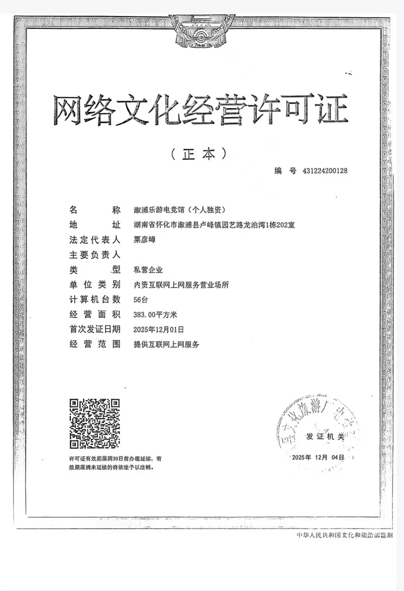 网络文化经营许可证---溆浦乐游电竞馆(个人独资)
