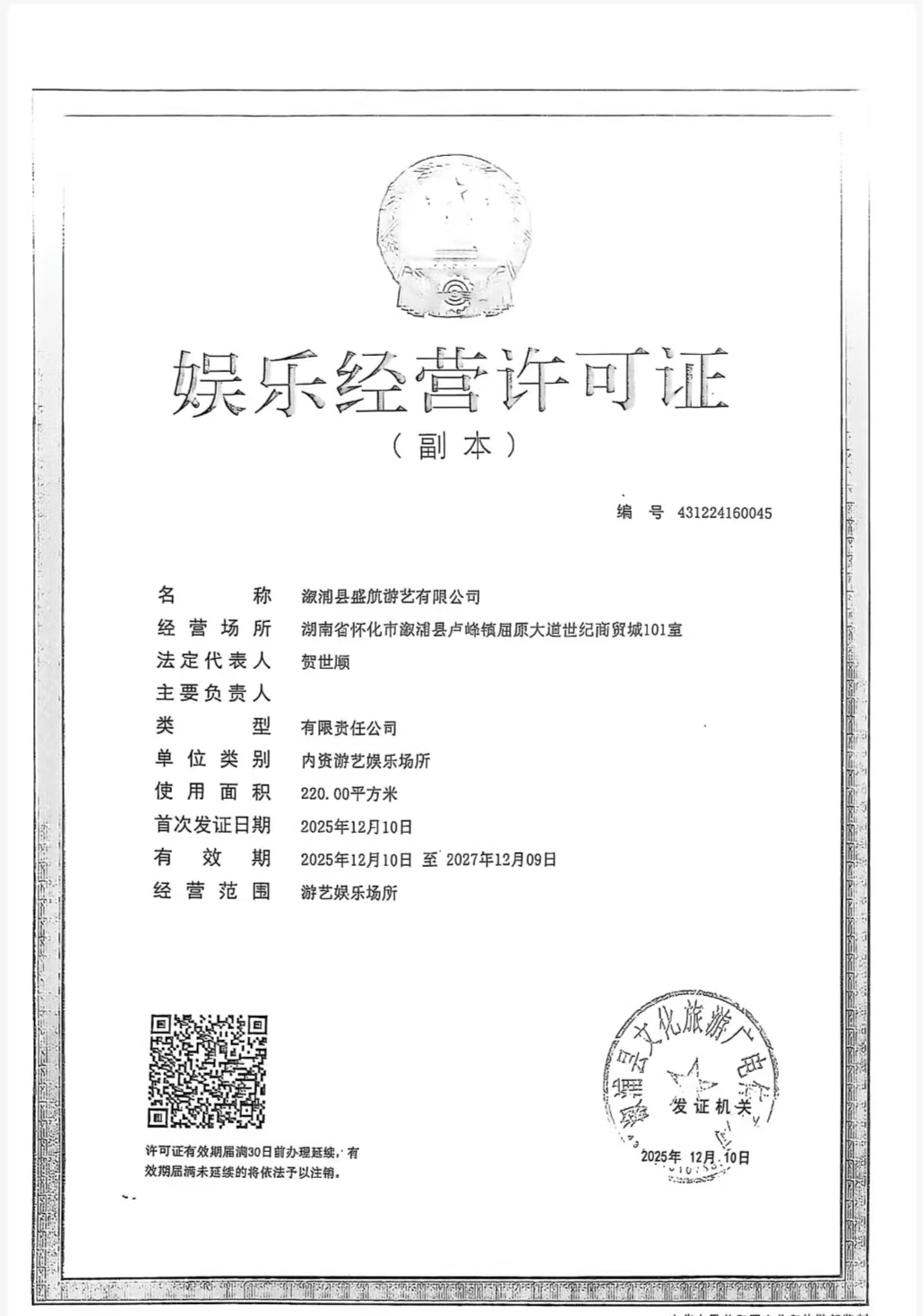 娱乐经营许可证---溆浦县盛航游艺有限公司