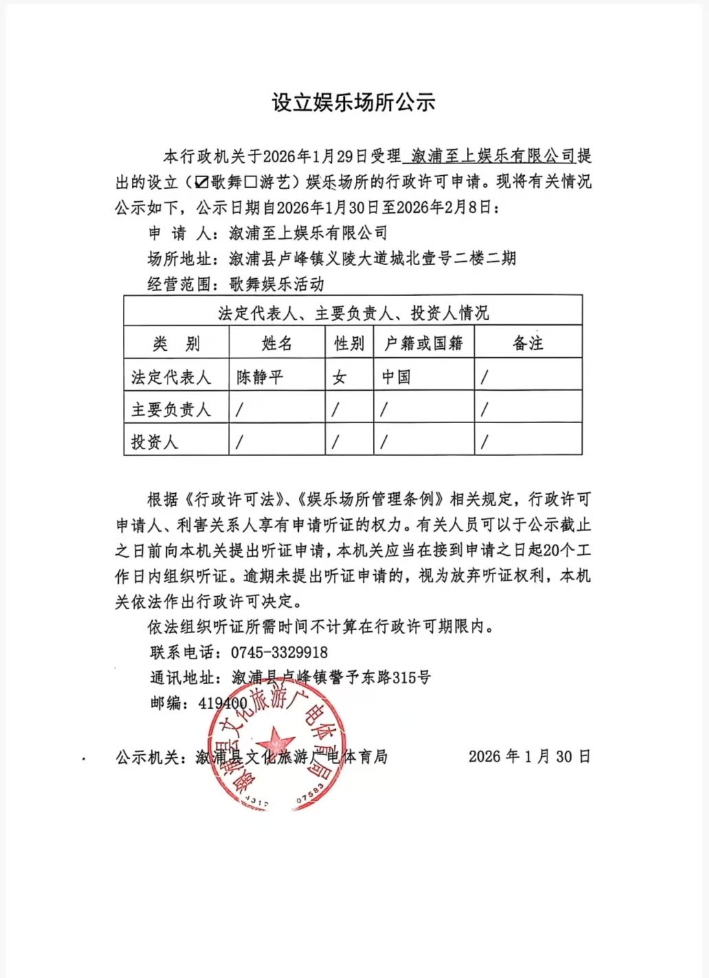 设立娱乐场所公示-----溆浦至上娱乐有限公司