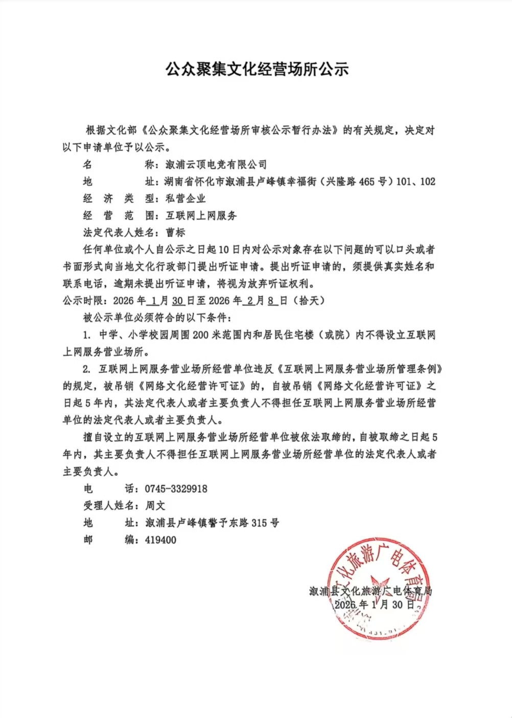 公众聚集文化经营场所公示-----溆浦云顶电竞有限公司