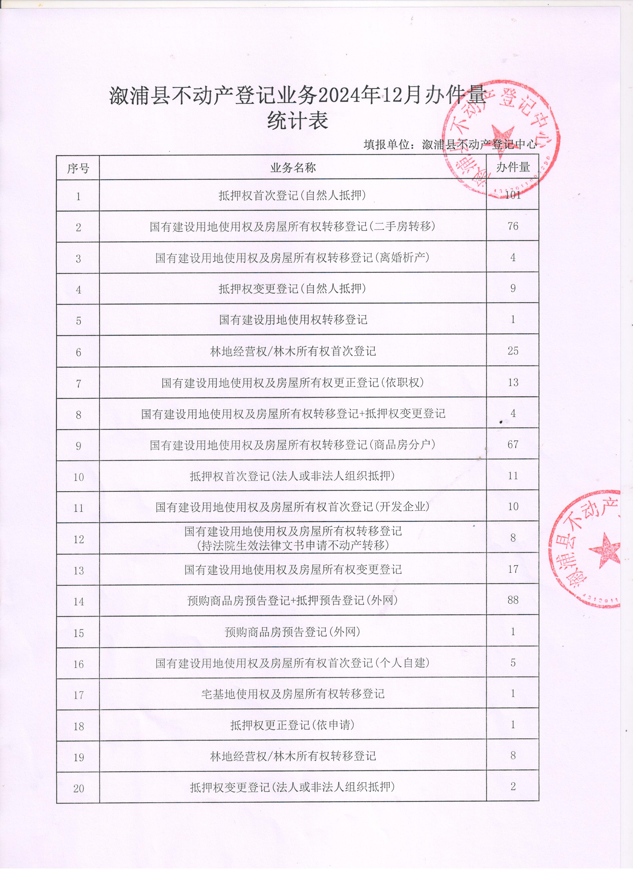 溆浦县不动产登记业务2024年12月办件量统计表