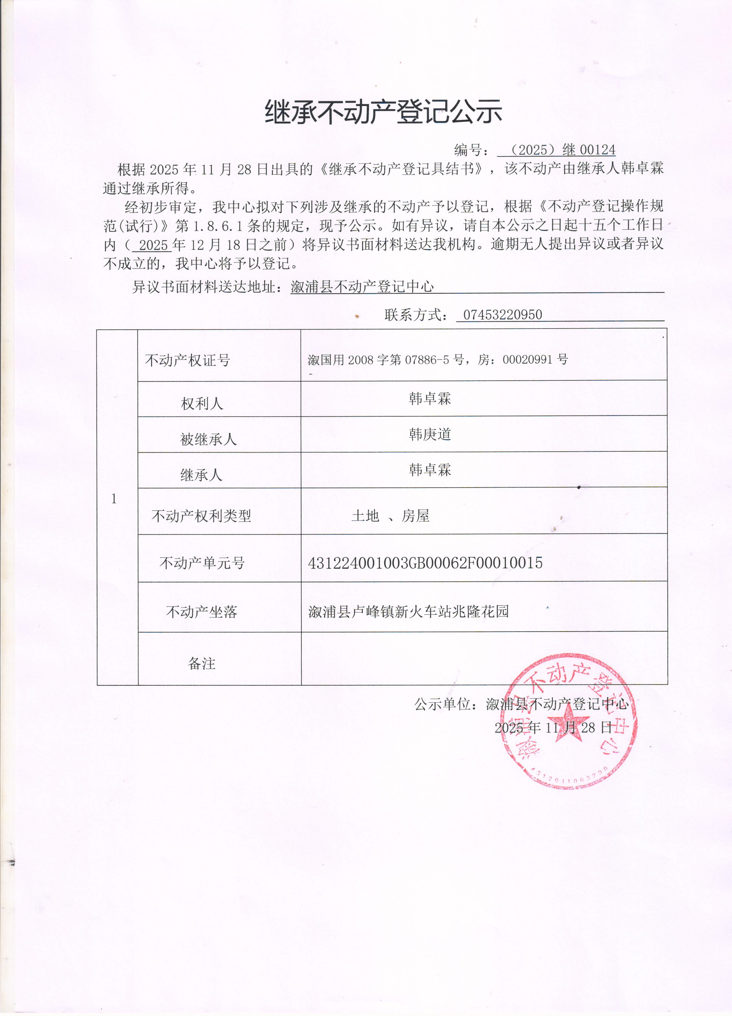 关于韩卓霖继承不动产登记公示