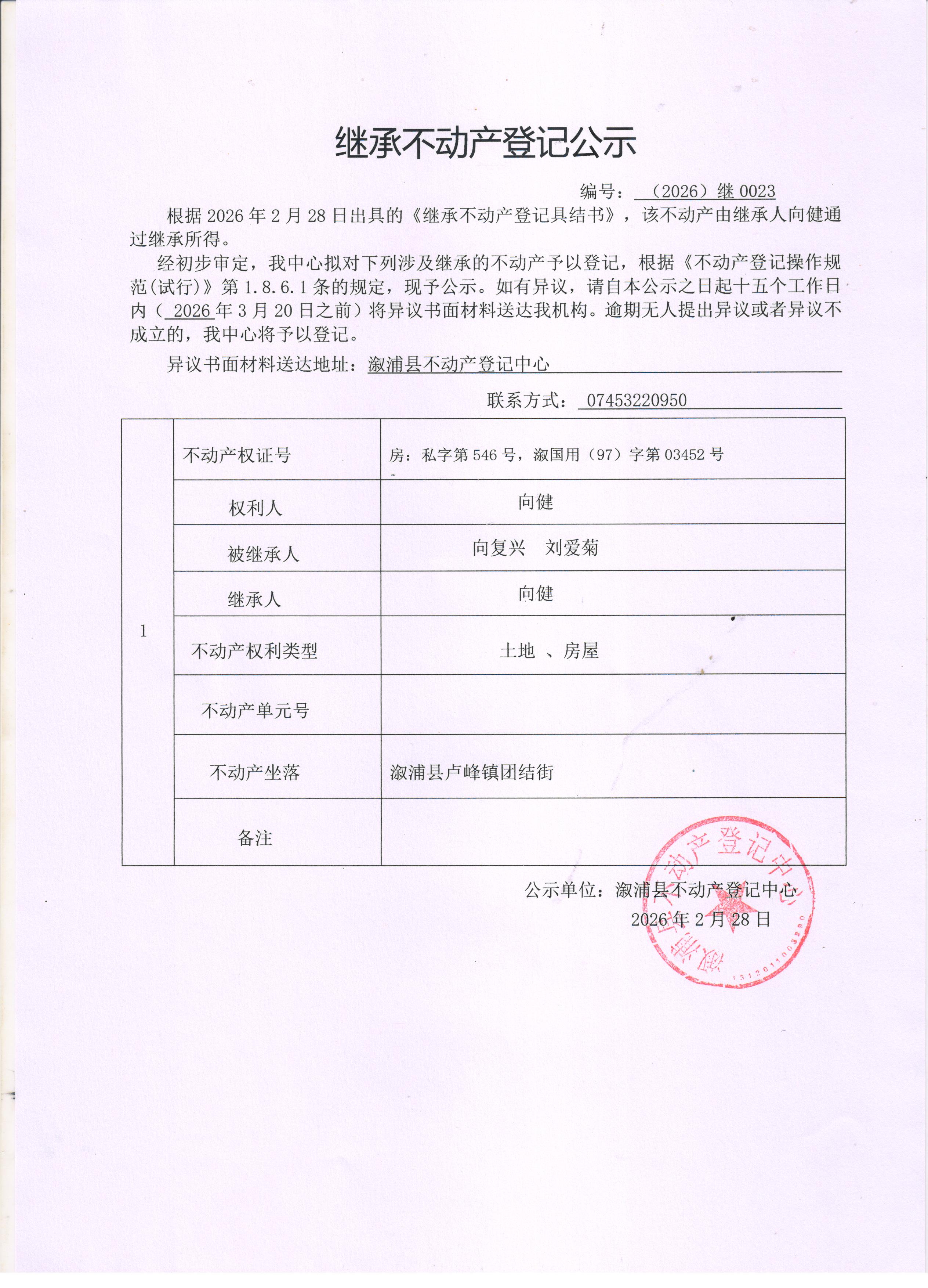 关于向健继承不动产登记公示