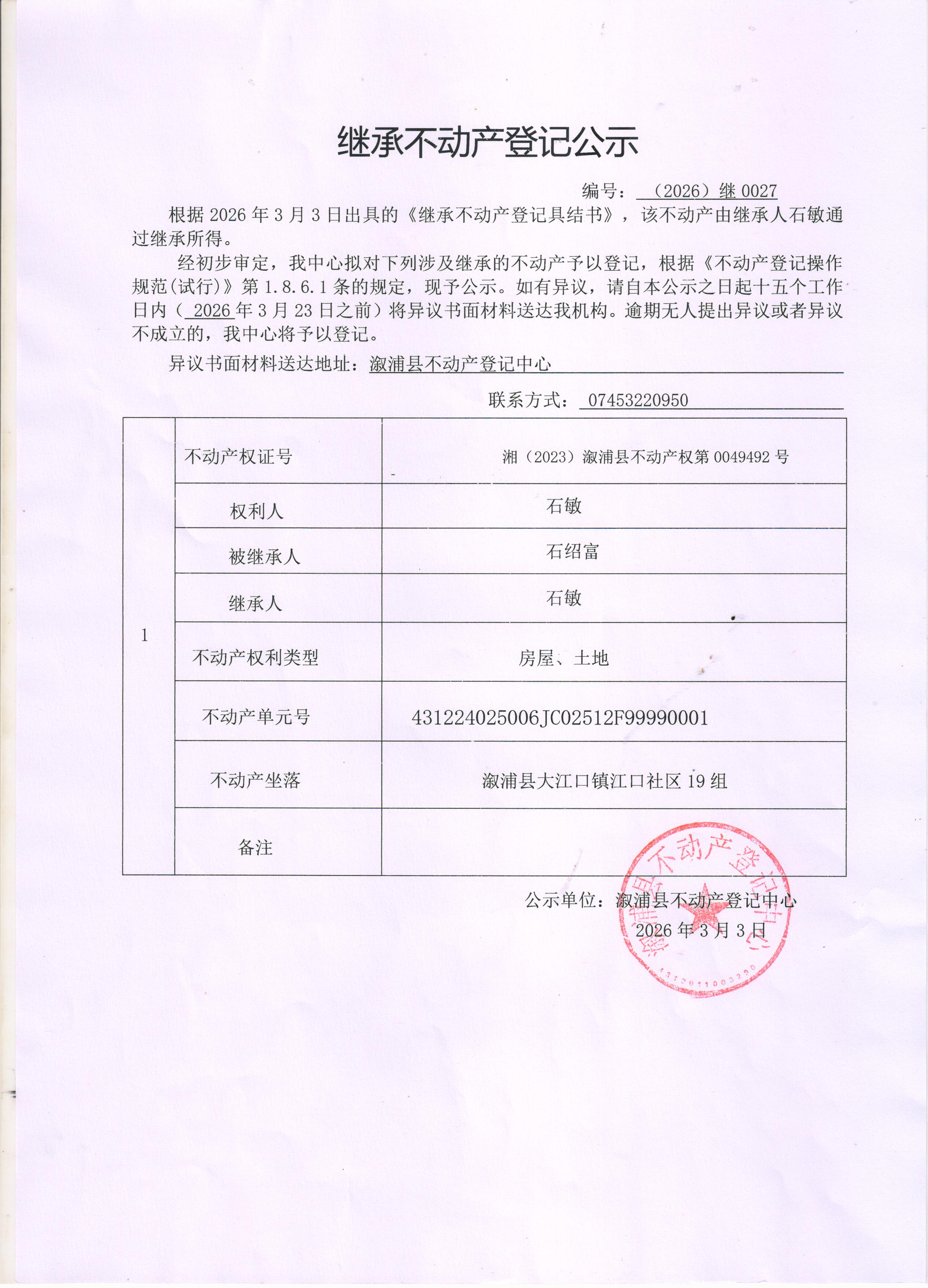 关于石敏继承不动产登记公示