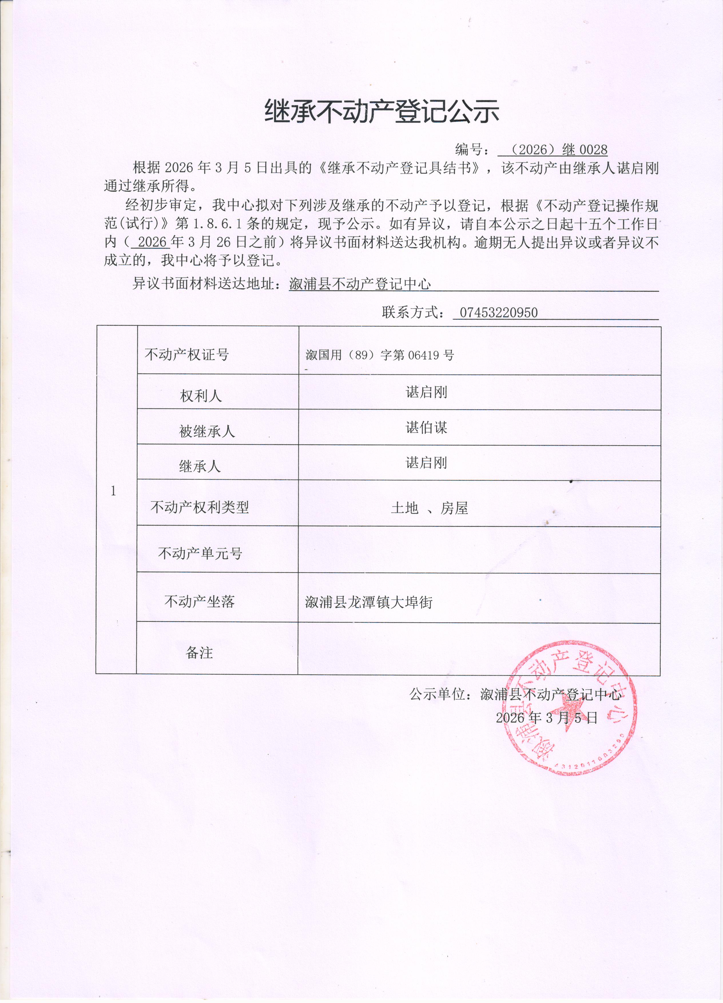 关于谌启刚继承不动产登记公示