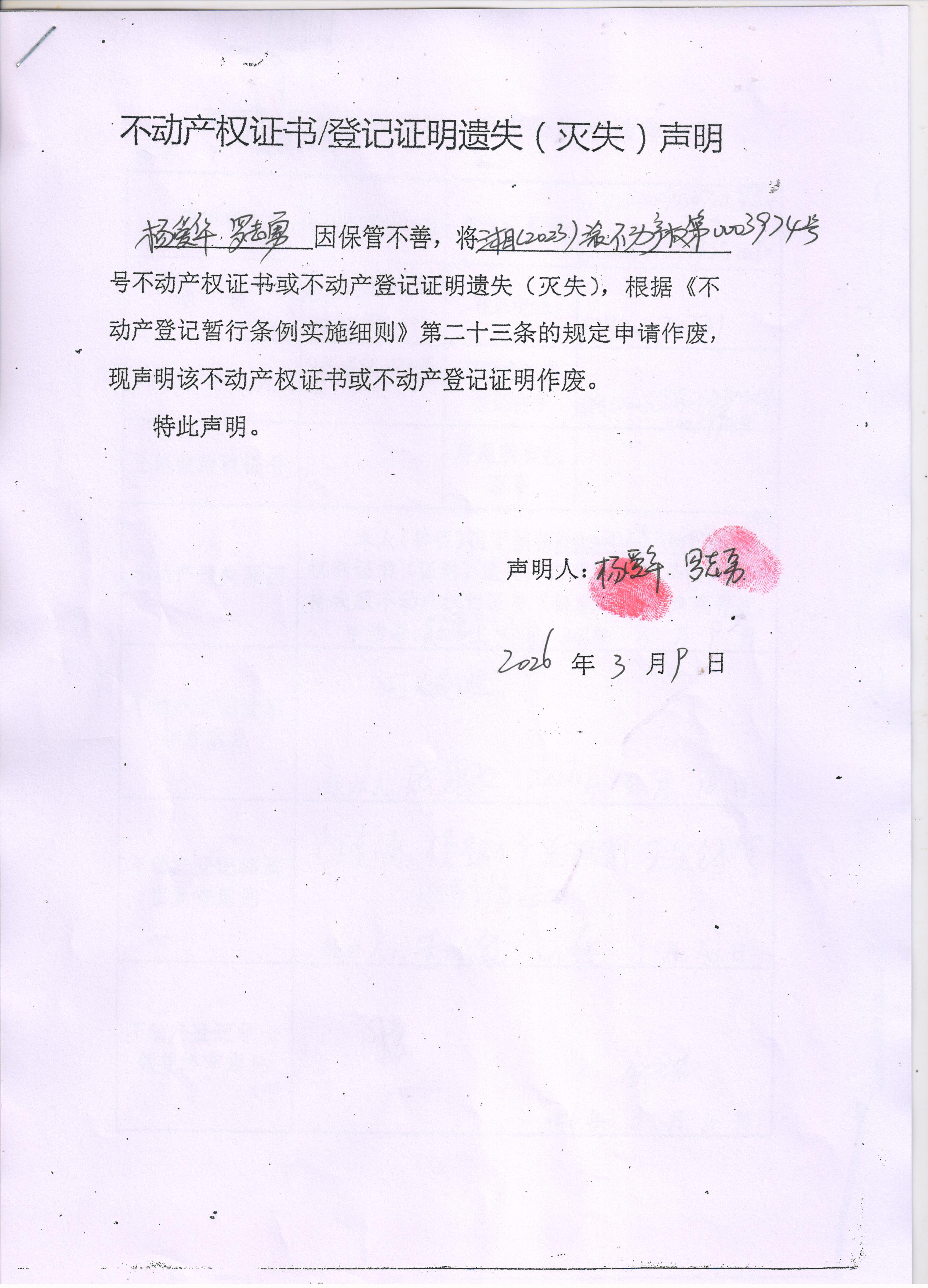 关于杨爱华、罗志勇不动产权证书/登记证明遗失(灭失)声明