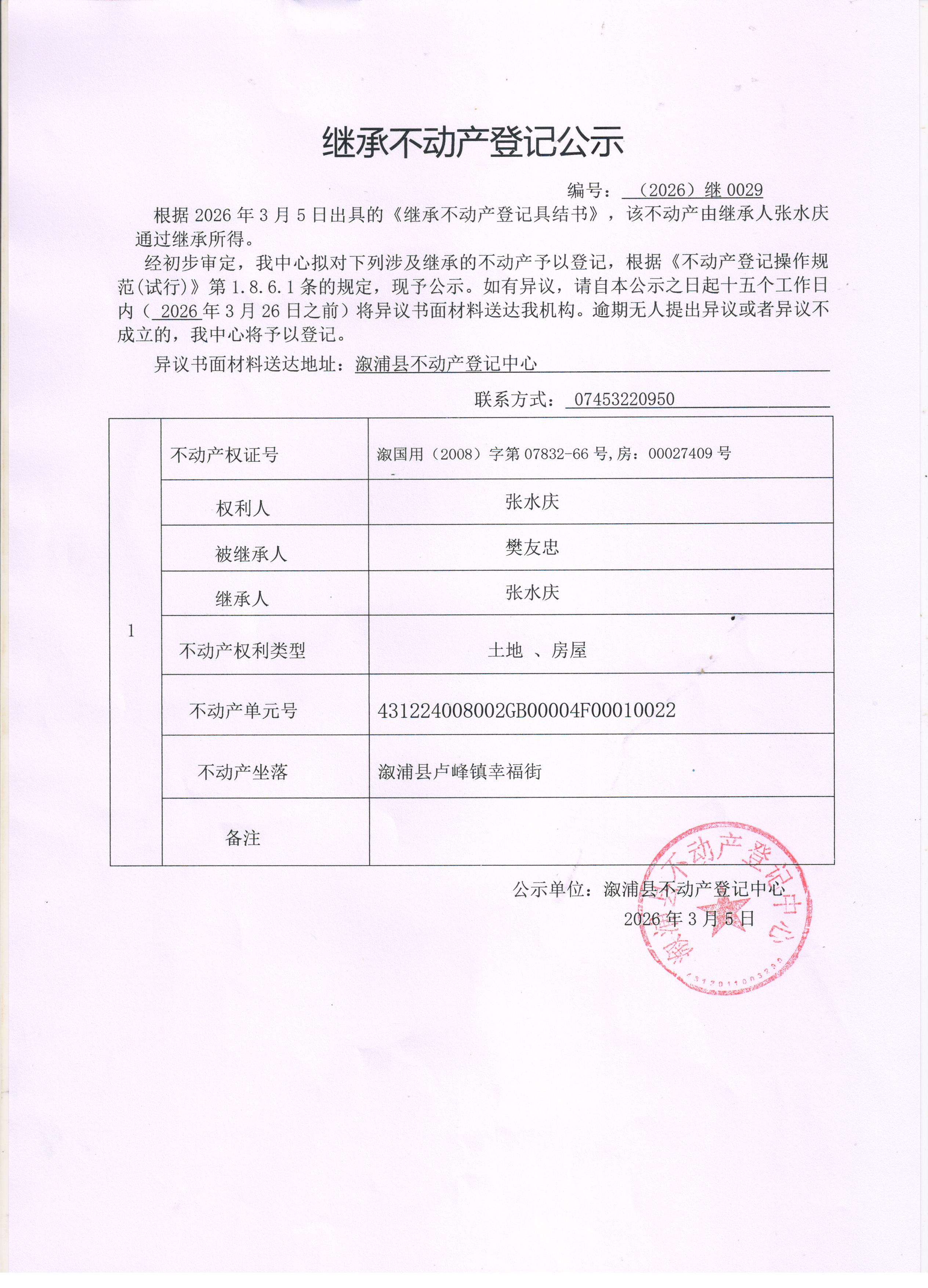 关于张水庆石敏继承不动产登记公示