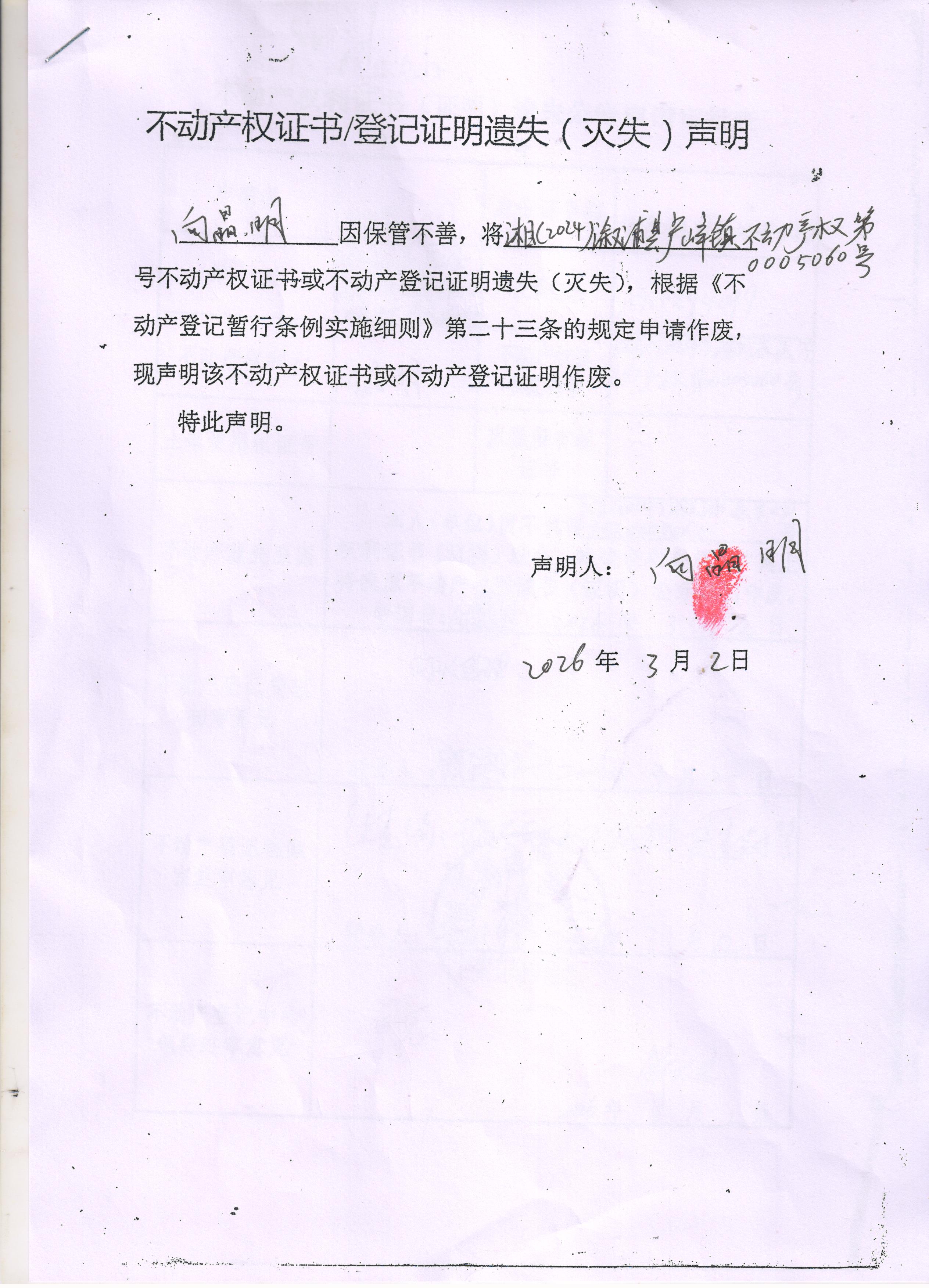 关于向晶明不动产权证书/登记证明遗失(灭失)声明