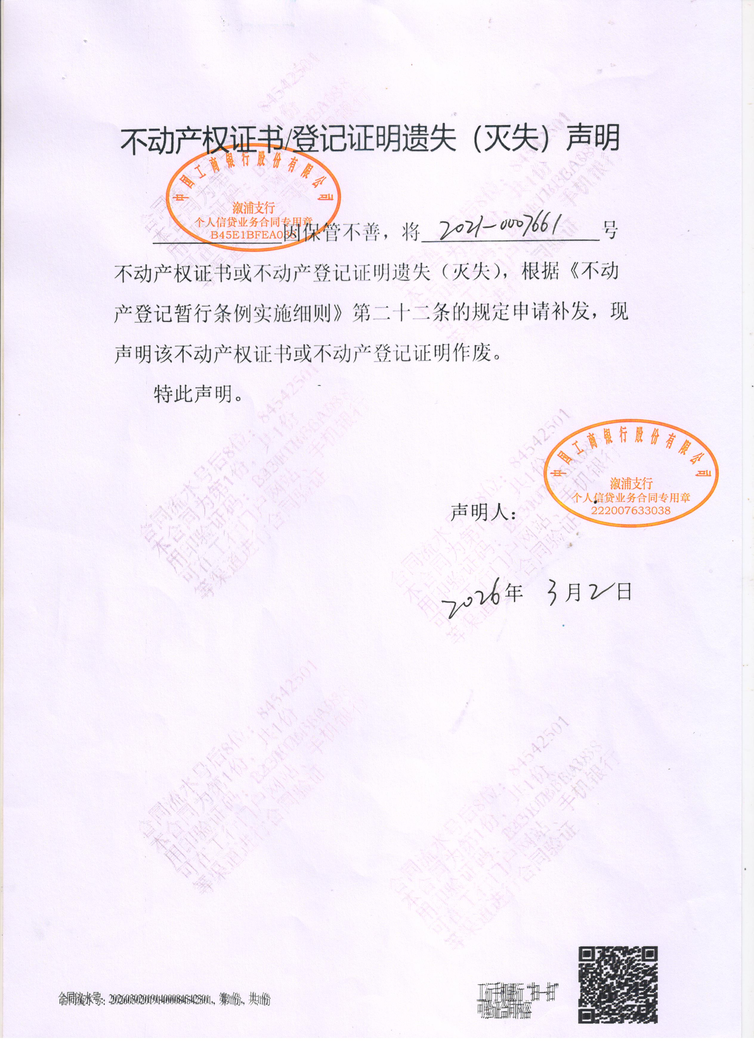 关于中国工商银行股份有限公司溆浦支行不动产权证书/登记证明遗失(灭失)声明