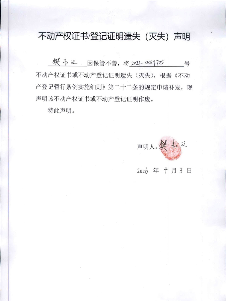 关于樊韦江不动产权证书/登记证明遗失(灭失)声明