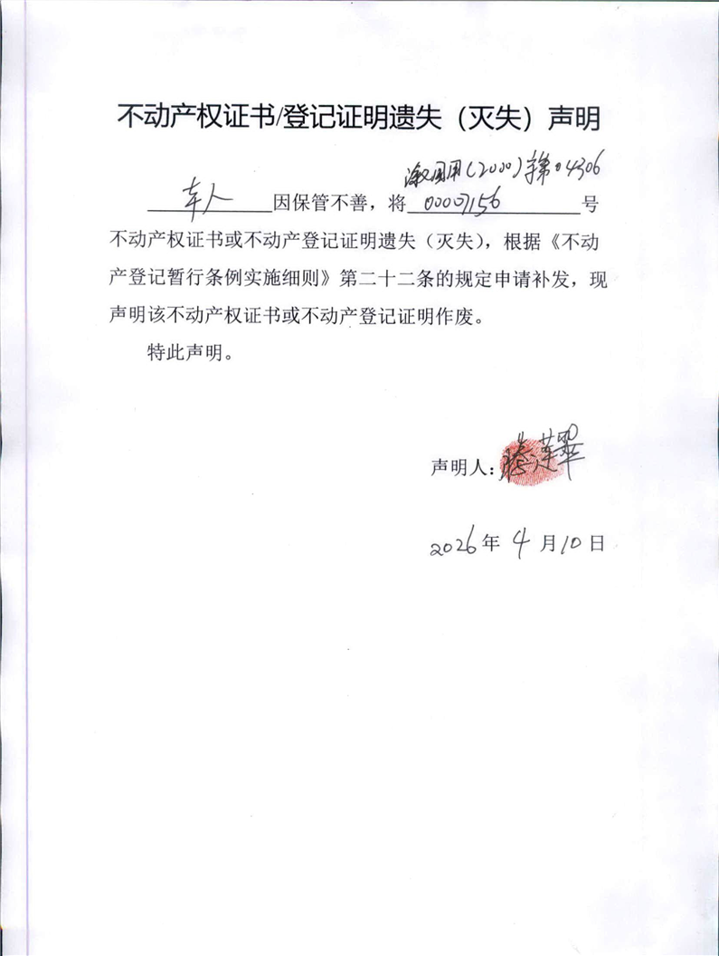 关于腾莲翠不动产权证书/登记证明遗失(灭失)声明