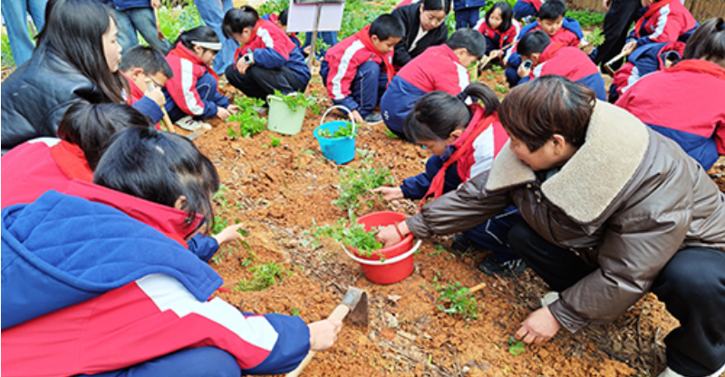 在“楚韵讲堂”上,老师将课堂搬进菜地,讲述了屈原故里的动人传说,科普了艾草温经散寒、驱蚊杀菌的药用价值。学生们听得入神,对家乡的草木文化有了更深的认识。随后的栽种实操环节,老师以“一锄松土细,二量尺间距,三放苗扶正,四培土压实,五浇定根水”的口诀进行示范。学生们领取艾草幼苗,在指定区域认真挖穴、放苗、覆土、浇水,并悬挂上班级种植标识牌,许下精心养护的承诺。