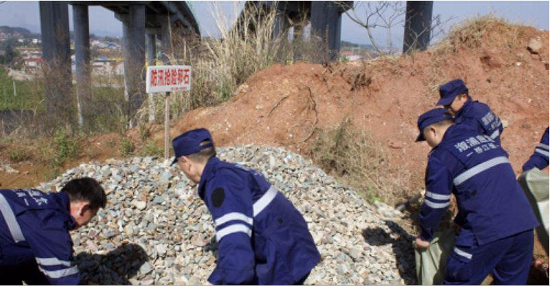抢险组快速装填沙袋