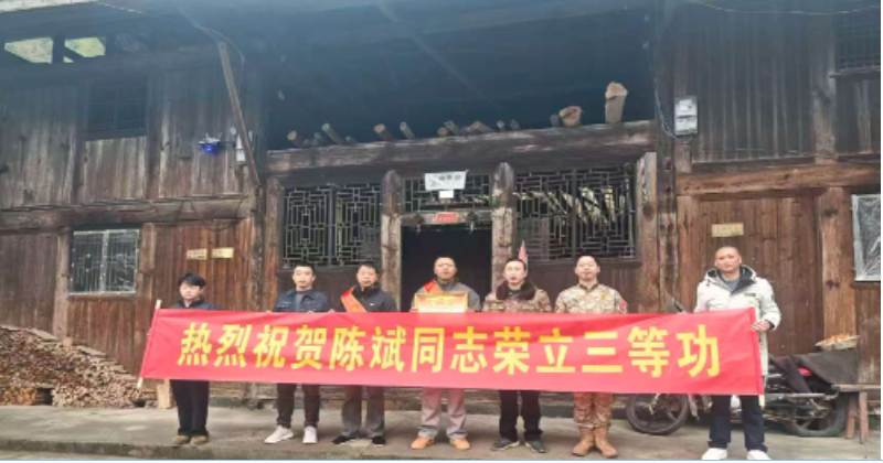 “咚咚锵!咚咚锵!”伴随着欢快喜庆的锣鼓声,工作组一行手捧鲜红的立功喜报、带着荣誉绶带和奖金,穿行在沿溪乡青坡村的乡间小道,引得邻里乡亲纷纷驻足围观、拍手道贺,热闹的氛围将冬日的寒意驱散殆尽。到达三等功臣陈斌家中后,工作组举行了简朴而庄重的喜报送达仪式。乡领导亲手将立功喜报、1000元立功奖金交到现役军人陈斌手中,为军属披上“一人立功、全家光荣”的荣誉绶带,与军属促膝长谈,细致询问家庭生产生活、老人健康、子女就学等实际情况,认真倾听诉求与困难,承诺将全力协调解决军属在生活中遇到的难题,切实做好拥军优属各项服务保障工作,让军人安心服役、无后顾之忧。