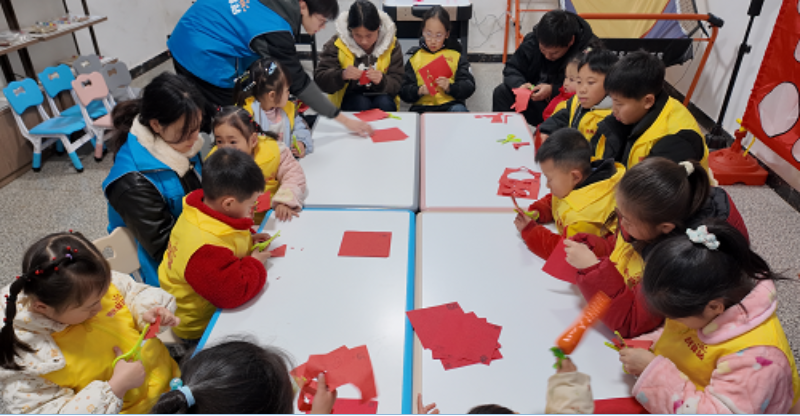 志愿者手把手指导孩子们剪纸