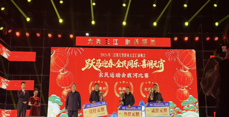 晚会中,激动人心的颁奖仪式将现场氛围推向高潮。现场为拔河比赛和篮球赛的获奖队伍、选手隆重颁奖。西湖村代表队摘得拔河比赛桂冠,乐园村篮球队斩获篮球赛第一名。运动健儿们在赛场上奋勇拼搏、团结协作的精神,正是三江人敢闯敢拼、同心奋进的缩影。