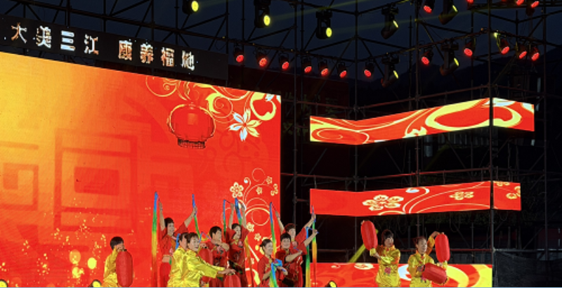 晚会现场灯火璀璨、人声鼎沸,15个精彩纷呈的节目轮番登场,歌舞、武术、非遗展演各具特色,为现场观众带来了一场视听盛宴。龙泉山村的灯笼舞《蒸蒸日上》拉开晚会序幕,红彤彤的灯笼映着村民们的笑脸,舞出了三江人民对美好生活的向往。县舞蹈家协会的《春水前溪》、乐园村的《国韵》尽显古典与文化之美,让观众沉浸在融融春意与中华传统文化的魅力之中。