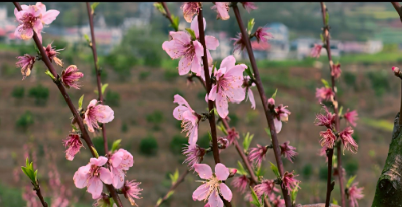 桃林间,一株株桃树枝头繁花锦簇,朵朵桃花娇艳欲滴。勤劳的蜜蜂穿梭其中,嗡嗡作响,忙着采蜜,为静谧的桃园增添了无限生机。微风拂过,花瓣轻轻飘落,空气中弥漫着淡淡花香,沁人心脾。