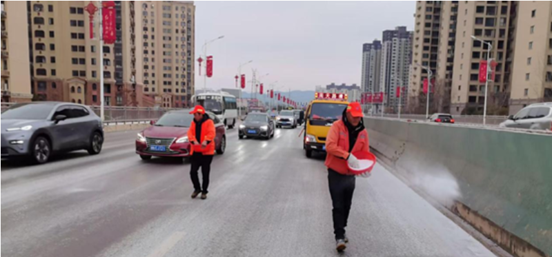 养护工人们身着醒目的橙色反光工作服,不畏严寒,有的挥舞着铁锹、扫帚清理冰层,有的手持工具抛洒融雪剂,他们争分夺秒,全力清除桥面冰雪,确保车辆能够安全通行。经过紧张的作业,桥面冰层被迅速清除,有效预防了因路面湿滑引发的交通事故。