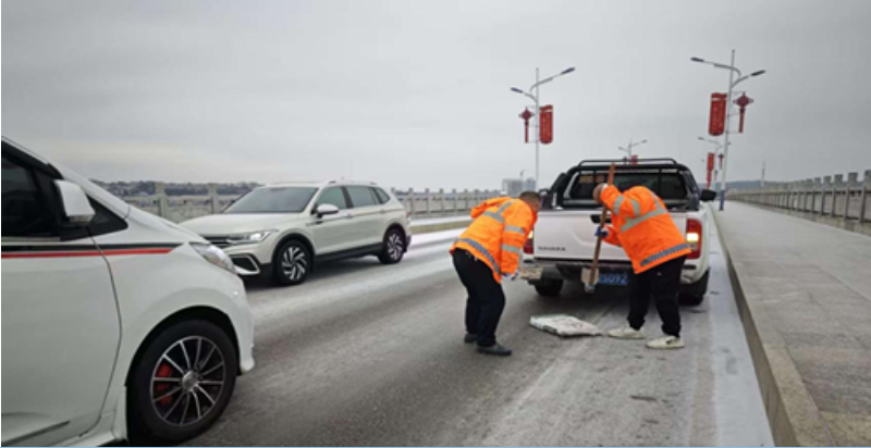 公路养护人员在溆浦二桥抛洒融雪剂进行除冰作业